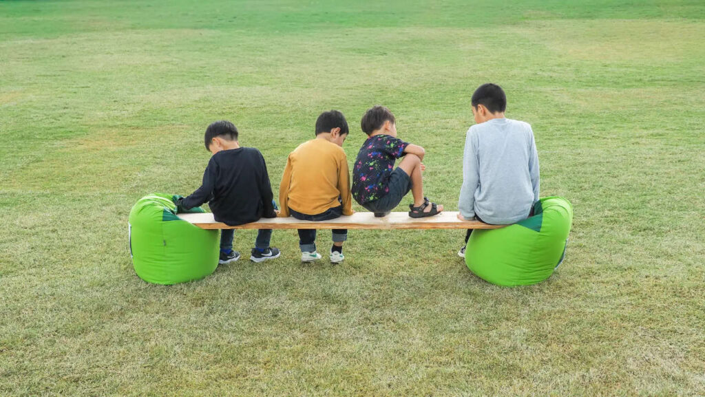 「森に座るベンチ」は、乾燥中のヒノキ天板と地域企業のビーズクッションを組み合わせている。天板には木材のわずかな反りや根曲がり、荒挽き材といった不定形な木の揺らぎが残るが、クッションがこれを柔軟に吸収するため、屋外の凹凸のある地面でも安定して使用できるのが特長だ。