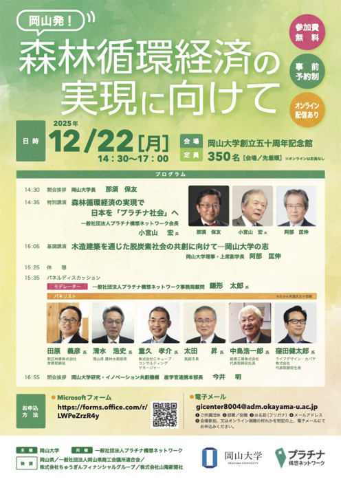 特別講演では、プラチナ構想ネットワーク会長・「森林循環経済」名誉編集長の小宮山宏氏が、森林循環経済の観点から、地域資源を活かした「プラチナ社会」実現へのビジョンを提示する。続く基調講演では、岡山大学理事・上席副学長の阿部匡伸氏が登壇し、中高層木造建築の普及に向けた技術開発や、脱炭素化を支える研究戦略を紹介する。岡山大学はグリーンイノベーションセンター(GIC)を中心に、木材利用の高度化や人材育成を進め、県内産業との連携強化を図ってきた。岡山という地域に根ざした研究は、森林資源の新たな価値創出の核となっている。
