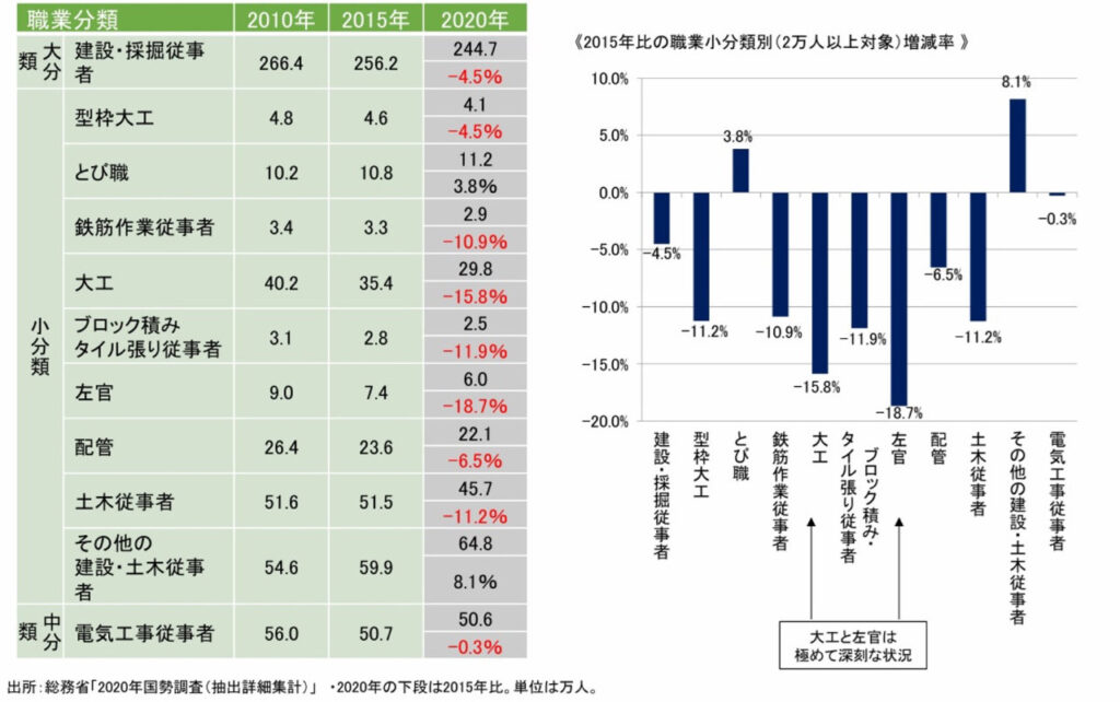 建設産業では、大工・左官・鉄筋といった主要技能工種の高齢化が進み、60歳以上が突出するなど、担い手不足が進行している。これらの工種は習熟に約10年近くと長期を要し若年層が定着しにくく、外国人材も言語の壁から戦力化にはさらに時間を要する。実際、工事現場には一定数の若手もいるため表面化しにくいが、クロス・ボード・鳶など若年層が多い工種と、大工・左官・鉄筋のように高齢化が進行している工種との差は大きく、建物の骨格を担う工種ほど深刻な人材不足に直面している。