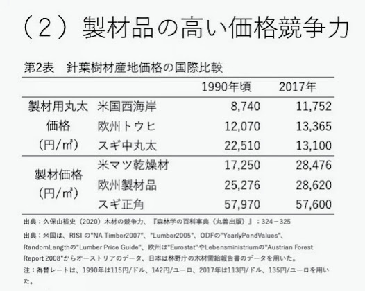 現在、日本の製材業は厳しい状況に直面している。特に、丸太価格に対する製品価格の倍率(製材品価格/丸太価格比率)が1990年頃の2.6から4.4まで拡大するなど製材加工コストが膨らんでおり、価格競争力が低い状況が続いている。1990年頃には高価であった日本のスギ丸太価格は、2017年には欧州トウヒ材丸太とほぼ同等にまで下落したにもかかわらず、製品価格では依然として大きな差が見られる。例えば、2017年時点で日本のスギ正角材の価格は57,600円/立方メートルであり、欧州製材品の28,620円/立方メートルと比較して倍近い価格水準にある。
