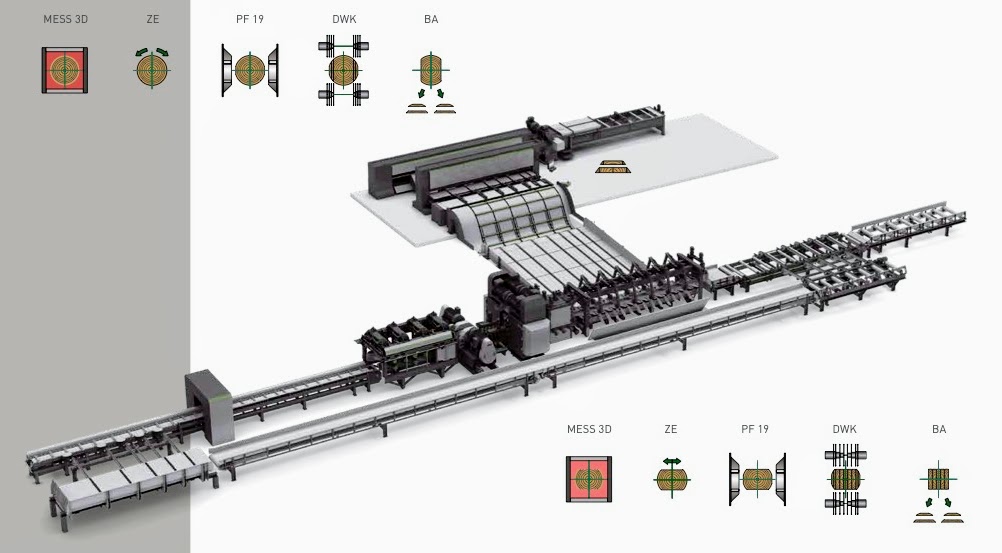 プロファイリングラインでは、チッパーキャンター(切削刃付きの製材機)で丸太を粗挽き角材にし、スキャナーで最適な木取りを決定した後、丸ノコ等で高速に板を挽いていく。オーストリアの製材スピードが120m/分に達するのに対し、日本のツインバンドソーなどを用いた従来の製材機では30m/分前後であり、圧倒的なスピードの差が生産効率を分けている。