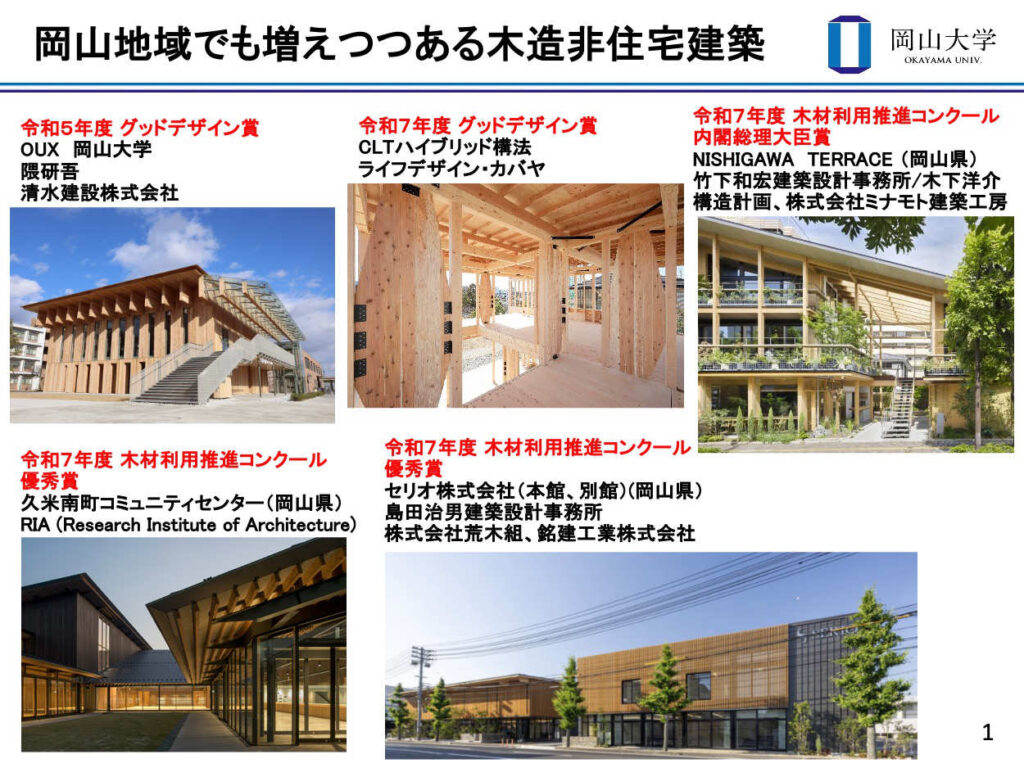 技術的課題である耐火性についても、2022年に構築された岡山大学グリーンイノベーションセンター(GIC)での研究成果を紹介した。従来の耐火技術は薬剤等による被覆が必要であったが、岡山大学では樹種の異なる木材の「赤熱燃焼温度の差」を利用し、木だけで燃え止まる「純木質耐火構造」を研究している。さらに、丸太を束ねて大空間を実現するBP材(バインディング・パイリング・ティンバー)の導入など、地域の中小製材所の技術を活かせる新たな工法も検討している。