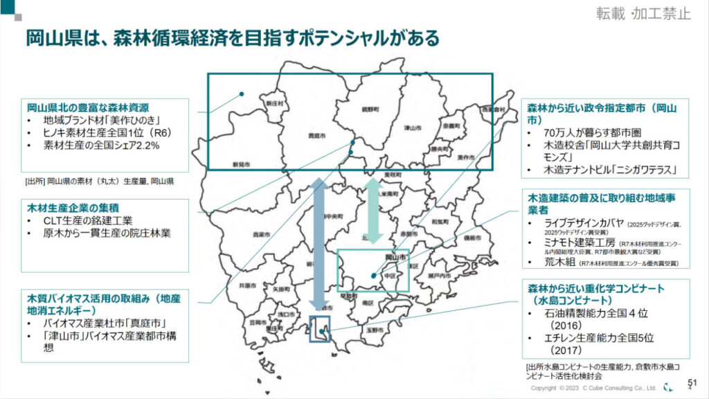 国産材需要の停滞や林業の担い手不足といった課題が全国的に顕在化するなか、ヒノキ生産量全国1位を誇り、CLT(直交集成板)産業の集積地でもある岡山県では、「森林循環経済」の実装に向けた産官学連携の動きが加速している。2025年12月22日、岡山大学で開催されたシンポジウム「岡山発!森林循環経済の実現に向けて」では、森林資源を川上(林業)から川下(建築・エネルギー)まで多段階で活用し、脱炭素と地方創生を同時に実現するための具体的な戦略と、最新の進捗事例が示された。