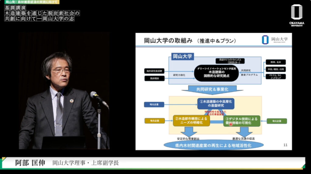 さらに阿部氏は、デジタル技術を用いたサプライチェーンの改革を提唱した。情報をBIM(ビルディング・インフォメーション・モデル)で共有し需要を可視化することで、計画的な伐採と再造林を可能にする。戦略的アライアンスを通じた合意形成により、リスクを公平に分担しコスト競争力を高めるこの仕組みこそが、技術・教育・産業が一体となって脱炭素社会を創り出す「岡山モデル」の核心となる。