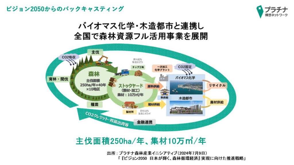 プラチナ森林産業イニシアティブが推進する「ビジョン2050 日本が輝く、森林循環経済」の実現を目指します。森林資源のフル活用による脱炭素・経済安全保障強化・地方創生に向け、バイオマス化学の推進、まちの木造化・木質化の実現、林業の革新を後押しするアイデアや取り組みを発信します。