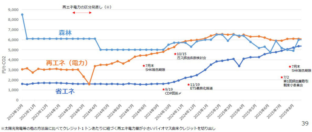 J-クレジットの価格推移(出典:経済産業省(2025)「割当てにかかる個別論点等について」)