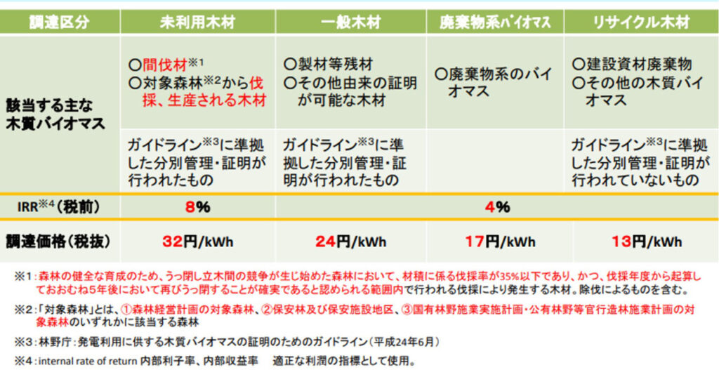 固定価格買取制度(FIT)においては、木質バイオマスを由来別に区分し、間伐材や林地残材といった未利用材を用いる発電に対して、より高い売電価格を設定している。この仕組みにより、発電事業者は未利用材を継続的に調達する経済的なインセンティブを持ち、林業側には新たな木材需要と収入機会が生まれる。