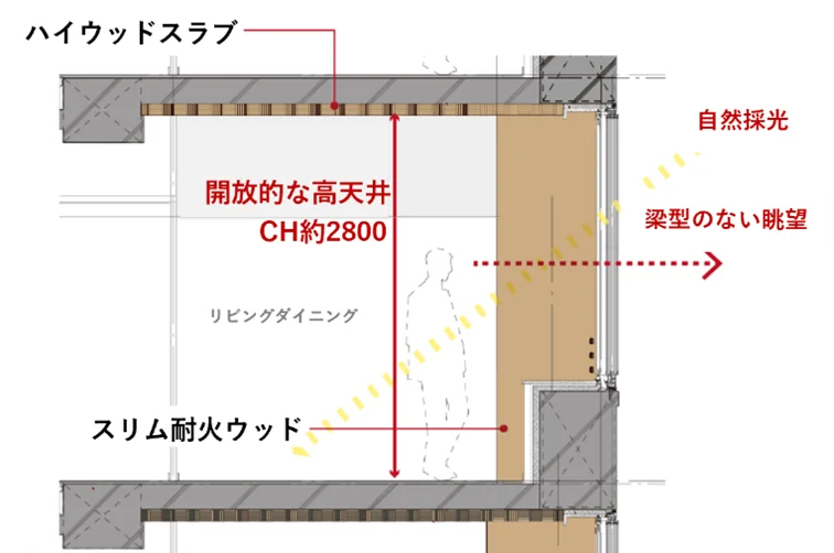 技術面では、清水建設が開発した木質建築技術「シミズハイウッド(R)」が活用されている。木材を構造体や内外装の仕上げ材として効果的に配置したほか、梁を床側に設置する「逆梁構法」を採用した。これにより、天然木に囲まれた開放感のある住空間を実現した。