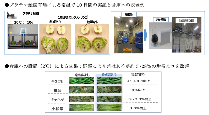 これにより、流通プロセスにおけるフードロス削減に大きく寄与しています。すでに日立GLSの家庭用冷蔵庫に搭載されているほか、北海道のコンビニエンスストアチェーンである「セコマ」グループの巨大な物流倉庫などで導入されており、白菜やキャベツなどの歩留まりが大幅に向上し、触媒の設置コストを上回る経済効果を生み出しています。