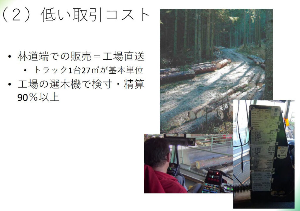 さらに興味深いのは、森林所有者の経営姿勢である。所有者は森林組合連合会(WV)に代理交渉を依頼することもあれば、より高い収益を目指して直接工場に営業をかけ、自ら販売先を開拓するケースも珍しくない。久保山氏は、所有者が自らの丸太がいくらで売れるのかに対して非常にシビアであり、その意識の高さが流通の透明性と効率化を支えていると分析する。