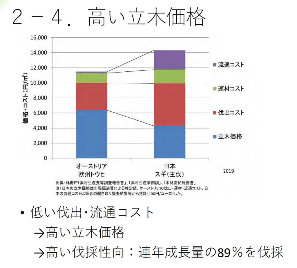 その結果として、オーストリアでは「連年成長量の89%を伐採する」という、高い伐採性向が維持されている。資源をただ蓄えるのではなく、経済的に活用しながら循環させる理想的なモデルがここにある。また、造林コストそのものも、天然更新を主軸とすることで10万円/ha程度に抑えられており、大規模所有者が植林を行う場合でも、造育林コストが低いため、経営として十分に成立しているのである。