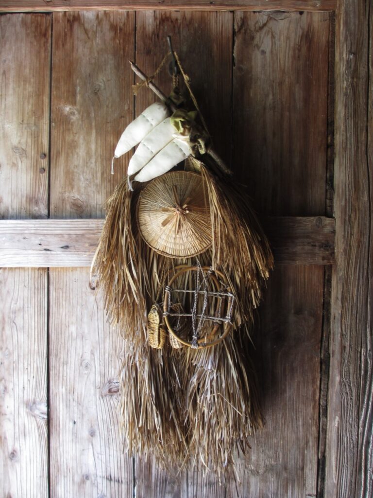 For protection from the sun and rain, "kasa" were used. The kasa has the role of a combination of today's umbrella and hat. It is convenient because it does not have a handle, leaving both hands free. The material is still wood, as it seems to be made of folded bamboo or thinly shaved and bent wood such as cypress or cedar. Kanjiki, footwear used in snow and agriculture to avoid being buried in mud, are also made from bamboo or kuromoji. There are also items similar to kanjiki in other countries, but most countries use animal skins, and salmon skin is used in Ainu culture.