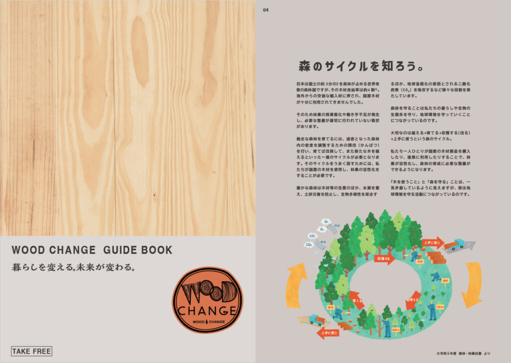In addition to the "WOOD CHANGE GUIDE BOOK," a leaflet introducing the purpose of the WOOD CHANGE PROJECT, the room also contains a collection of wood-related magazines, picture books, and photographs to help visitors learn about the forest issues facing Japan and how to utilize domestic wood.