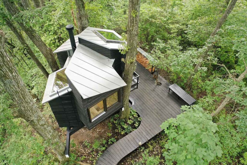 Between the four oak trees, four window spaces are arranged in a spiral pattern, with height differences, to provide users with a unique experience, as if they were enveloped by nature with their whole bodies.
