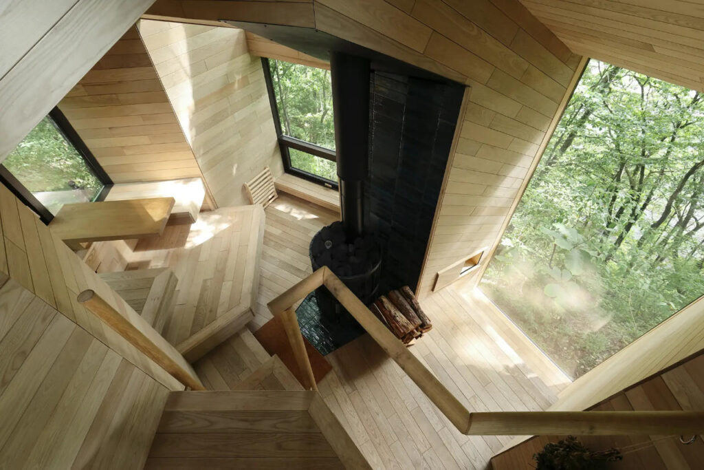 At the center of the interior is a wood-fired sauna that reflects the knowledge that Kitamoku has accumulated over the years. In addition to its function of warming the body through the warmth of the fire, the interior is decorated with local hardwood, Kihada, which was logged and milled by the company, to promote the circulation of natural capital within the community.