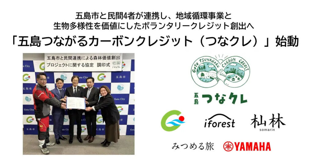Goto City, Nagasaki Prefecture, has signed an agreement for the joint project "Goto Connect Carbon Credit" (commonly known as Tsunakure), conducted in collaboration with four private entities: iForest, Somabayashi, Yamaha Motor Co., Ltd., and the general incorporated association Mitsumeru Tabi. The project aims to generate absorption and removal-based voluntary carbon credits (JVC) by utilizing unmanaged forests in Goto City and Kuga Island. The revenue generated will be used to implement a regional circular business model, including the development of forestry operators.